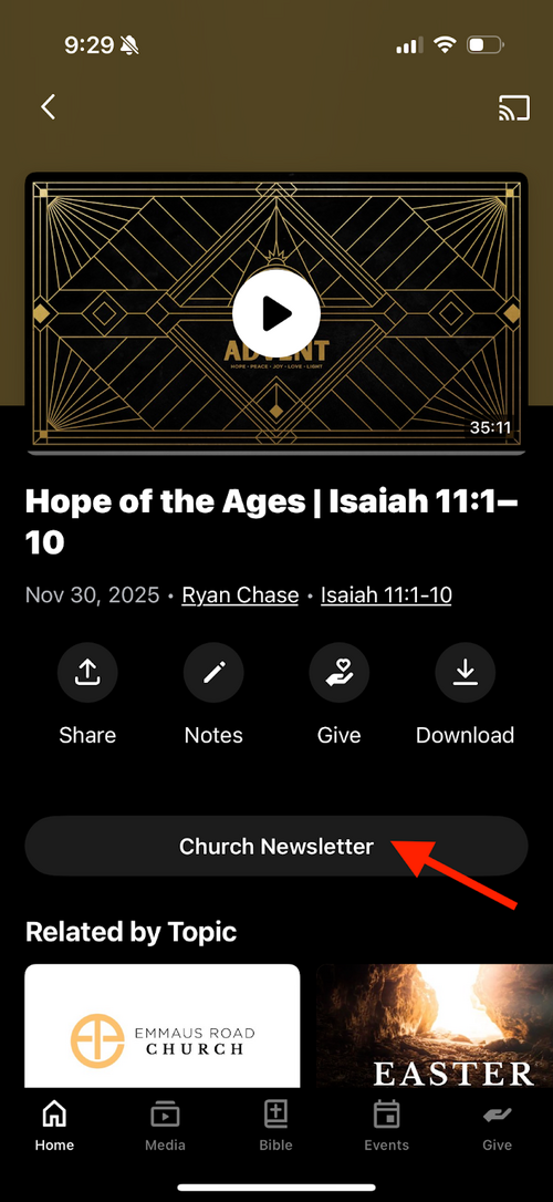 - Go to the “Current Sermon Series” on the media tab of the app or the "Sermons" section of the website and click on the latest sermon
