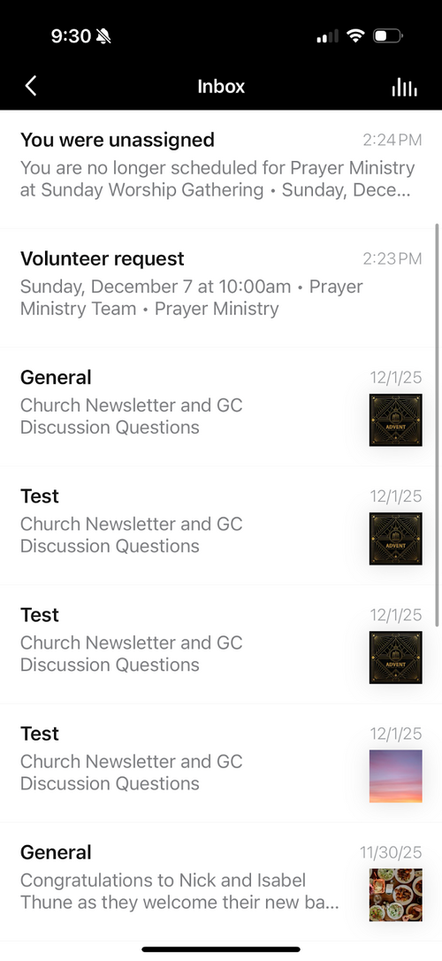 In order to find a notification after it has left the home screen of your phone (like an announcement of a meal train or a church wide message) you can click your profile, scroll down to your inbox and view them there.
