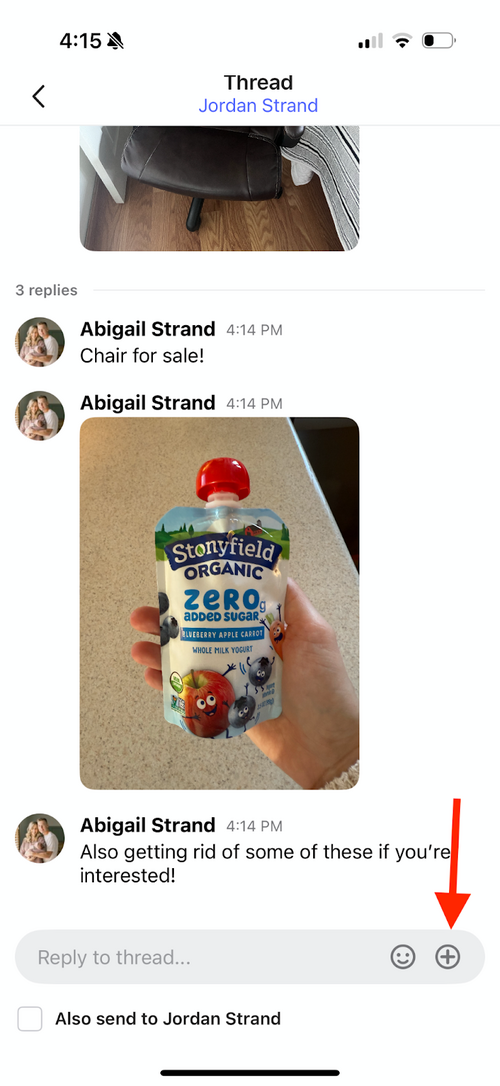 Overall, unlike Facebook, you are not able to add a message to a photo. So, if you would like to post a photo or multiple photos, our recommendation would be to post one photo and then respond in that same thread with more photos or any comments that you would like to include. It is also best to respond to any posts via a reply in that same thread if you are interested in an item.